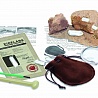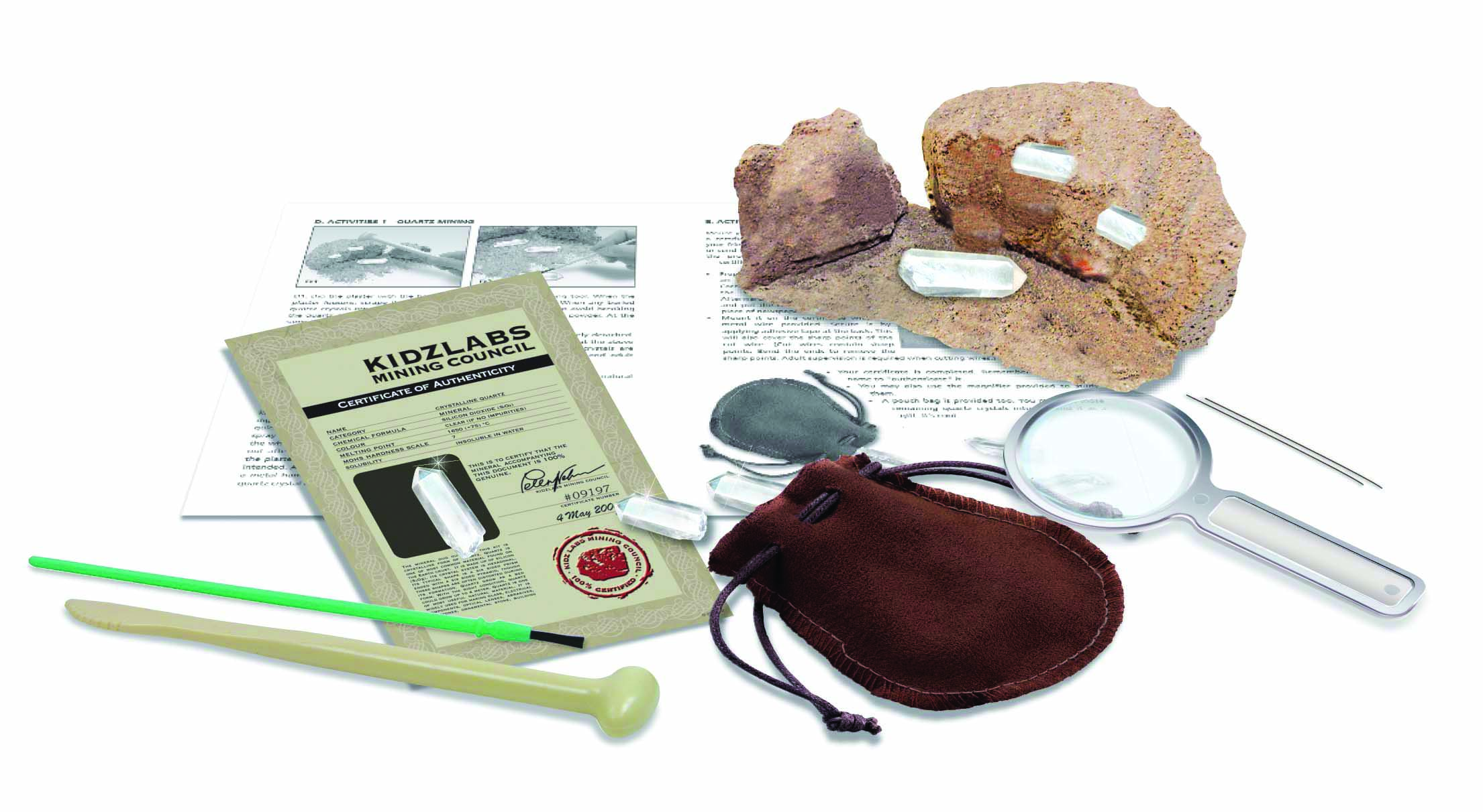 В состав набора входят: 1 гипсовый блок с 3 скрытыми природными кристаллами кварца (примерно 2-4 см. в длину), 1 специальный инструмент для раскопок, 1 кисточка, 1 лупа, 1 сертификат подлинности, 1 металлическая проволока для крепления, 1 мешочек, 1 детальная инструкция с интересными фактами.