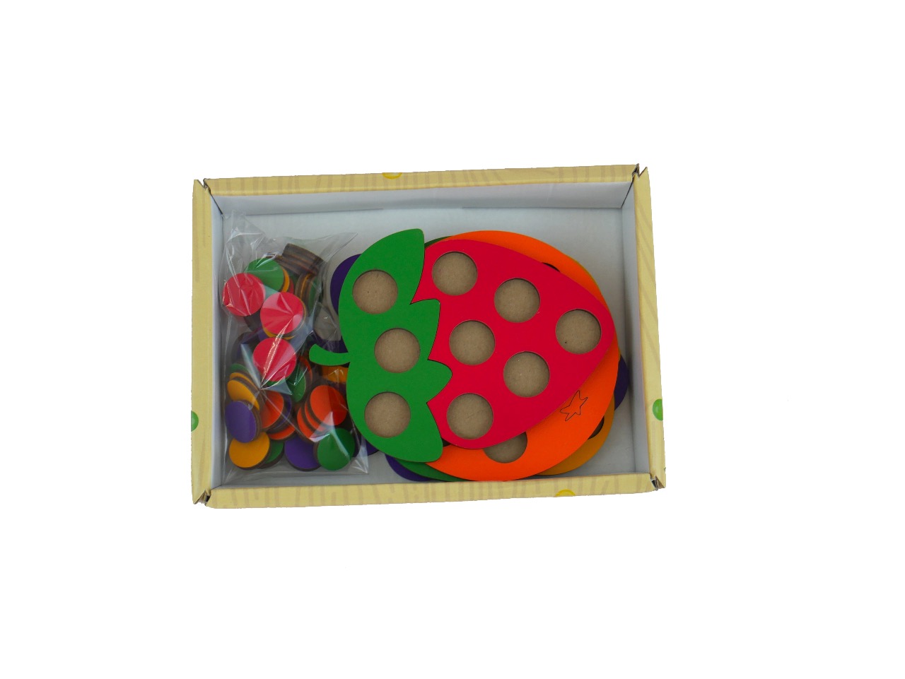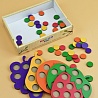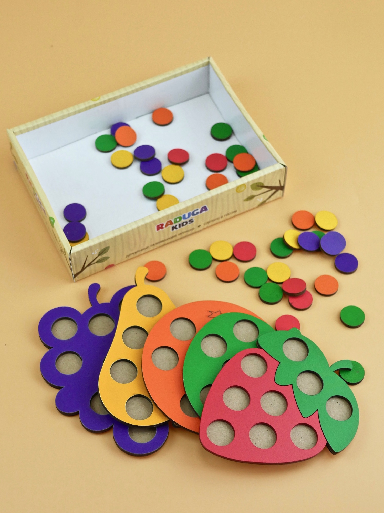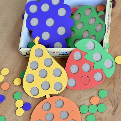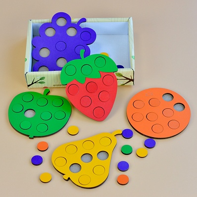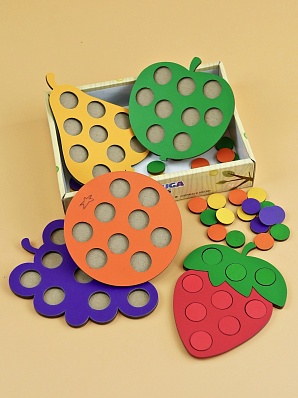Каждая фигура имеет отверстия, которые заполняются цветными кружками соответствующего цвета. Мозаика помогает развивать зрительное восприятие, тактильные функции, зрительную координацию, логическое и пространственное мышление.