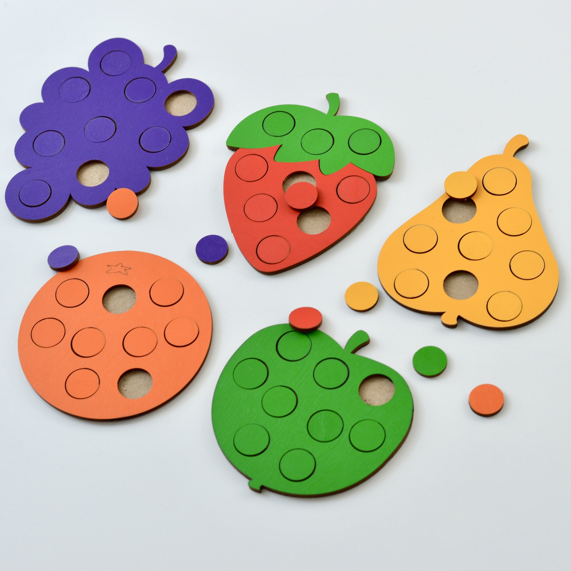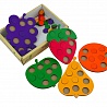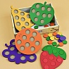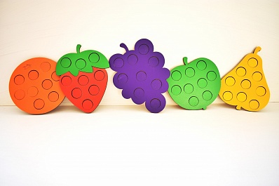 Яркая игра состоящая из 5 деревянных рамок-вкладышей в виде фруктов с отверстиями для сортировки по цветам. Деревянные фигуры в виде яблока, груши, винограда, клубники, апельсина на долго могут увлечь интересной и полезной игрой Вашего малыша.