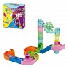 В комплекте для увлекательной сборки маленькие первооткрыватели найдут разноцветные вертикальные трубочки, горки, колёсико с лопастями, открытые прямые и изогнутые желобки, подставки.
