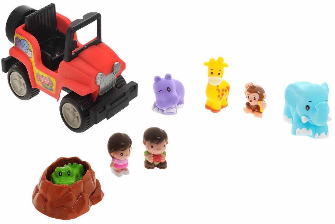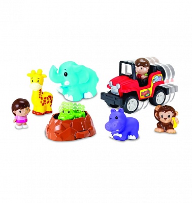 Комплектация: машинка, слон, жираф, обезьянка, бегемот, крокодил, 2 фигурки путешественников.