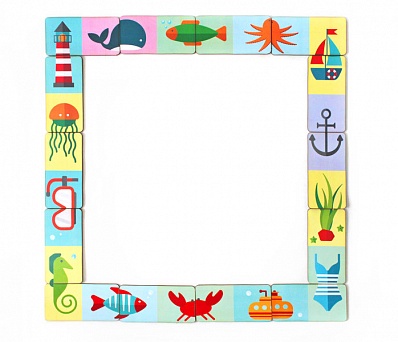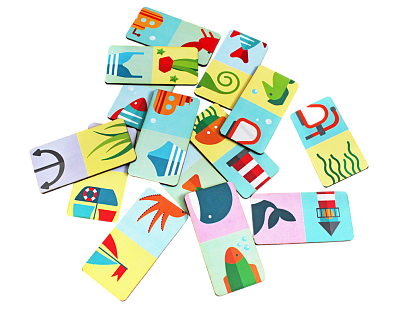 Как играть: Комплект содержит 14 домино с морской тематикой. Участникам выдается по 4 штуки, начинать ход первым - по договоренности. В ходе игры участники выкладывают домино в цепочки, состыковывая их таким образом, чтобы картинка с одного конца домино совпадала с картинкой на конце цепочки. Если подходящего элемента нет, нужно взять из оставшейся стопки.