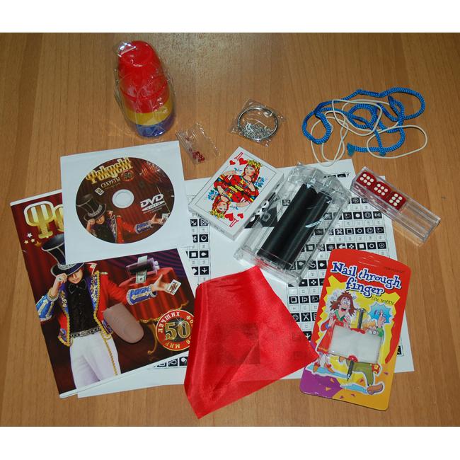 Комплект включает в себя множество атрибутов искусного престидижитатора, которые помогут ребенку в постижении тайн магического искусства. Помимо стандартных предметов - таких, как карты, веревка, а также игральный кубик со стаканчиками, комплект включает в себя несколько нетипичных инструментов.