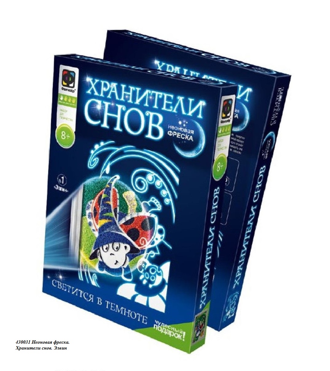 В набор входит: трехслойная основа с высеченным трафаретом, набор цветного песка, люминофор, заготовка рамки, деревянный стик, кисточка, бумажная салфетка, подробная инструкция.