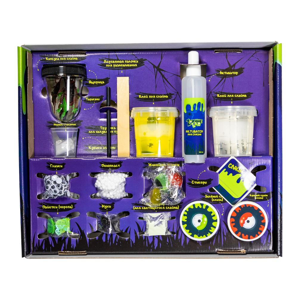Набор для создания слаймов и игры с готовыми слаймами для мальчиков «Лаборатория зомби». Сделай самый жуткий слайм с глазами, тараканами и мухами. Помести в колбу ящерицу и залей ее слизью! Укрась стикерами и подари другу.