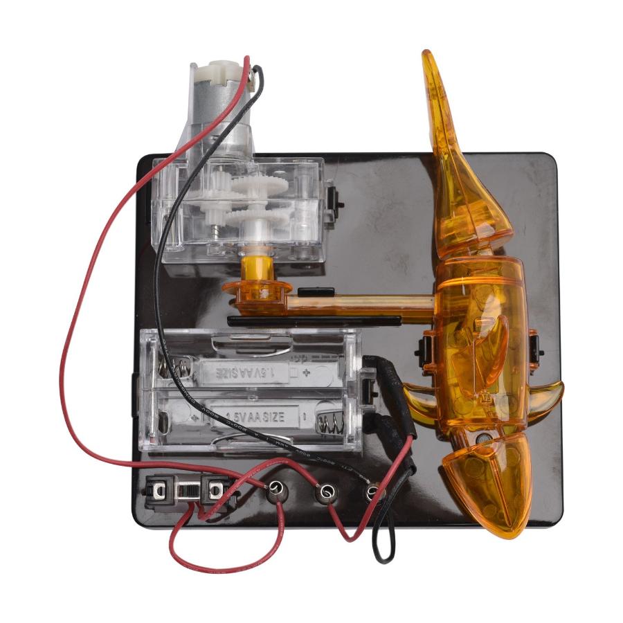 - Рыбка устанавливается на платформу, к которой подключен мотор. Соберите механизм, вставьте батарейки – и рыбка оживет.