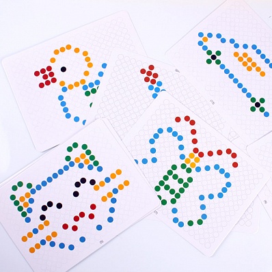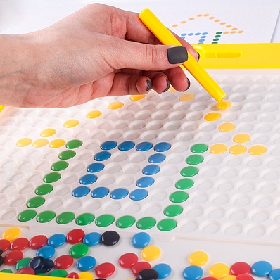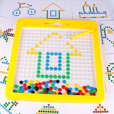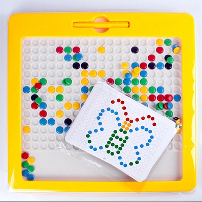 Передвижение фишек в ячейки происходит при помощи ручки с магнитным наконечником. В наборе идут карточки (10 шт, двусторонних) с образцами рисунков. ВАЖНО - все фишки запаяны в бокс, они не потеряются!