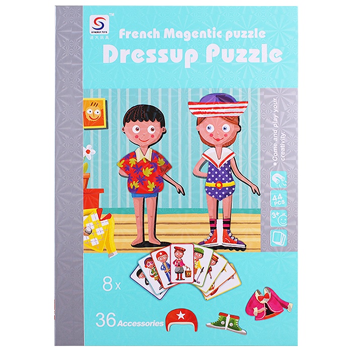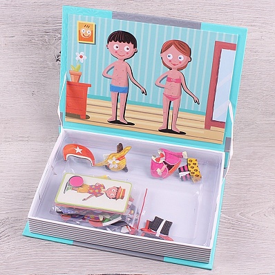 В наборе вы найдете 8 карточек кукл-мальчиков и девочек, а также разнообразные магнитные одежки и аксессуары для создания их образов.