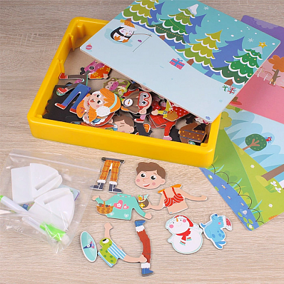 В набор входит двусторонняя магнитная доска (одна сторона цветная - для игры, другая сторона белая - для письма специальным маркером), части персонажей, карточки с подсказками, маркер, магнит.