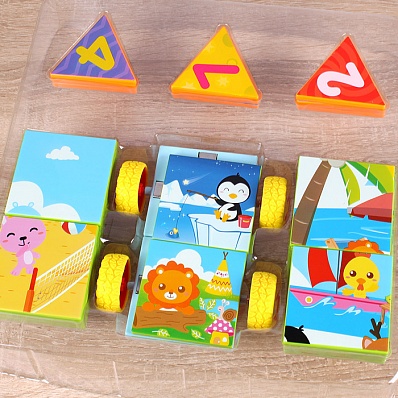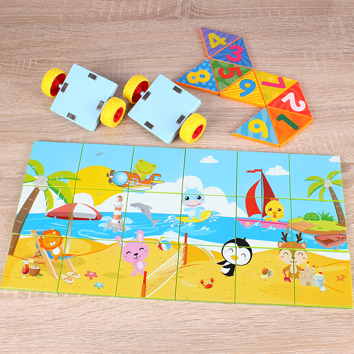 Конструктор содержит 2 платформы с колесами +9 треугольных (6,2см) +18 квадратных (6,5см) магнитных деталей , из которых можно сложить пазл, сделать различные фигурки, машинку.