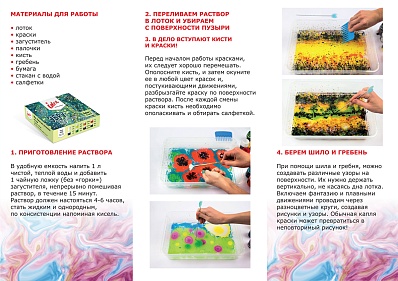 Набор для рисования в технике эбру способствует развитию художественных навыков, визуального восприятия и воображения, улучшает концентрацию внимания, помогает снять усталость, напряжение и стресс.