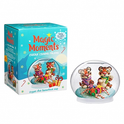 В наборе предусмотрено все необходимое, чтобы сделать такую волшебную сказку. Слепите композицию из пластилина, следуя инструкции, и прикрепите ее к подставке. Добавьте в сферу воду, блестки и специальные жидкости. И в конце аккуратно соедините обе части шара. Подарок готов!