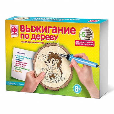 Во-первых, это удобный современный выжигательный аппарат с 6-ю сменными насадками, чтобы вам было легче сотворить именно то, что вы задумали. Во-вторых, это 2-е основы: 1-ая — спил дерева уже с нанесённым сюжетом будущего рисунка, а 2-ая— чистый лист фанеры 15×15 см.