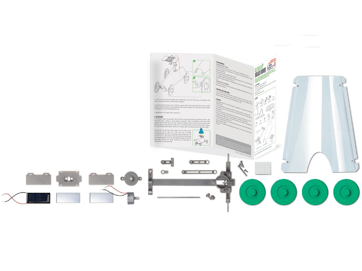 В состав набора входят: 2 коротких винта 1 средний винт 1 длинный винт двухсторонний скотч 2 наконечника прозрачный корпус 2 светоотражающих панели 1 солнечная батарея держатель солнечной батареи комплект вспомогательных компонентов рычага солнечной батареи 1 крышка двигателя мотор с проводами и червячной передачей на колеса 4 колеса 1 ось 1 шасси с задним мостом подробная инструкция на русском языке с интересными фактами.