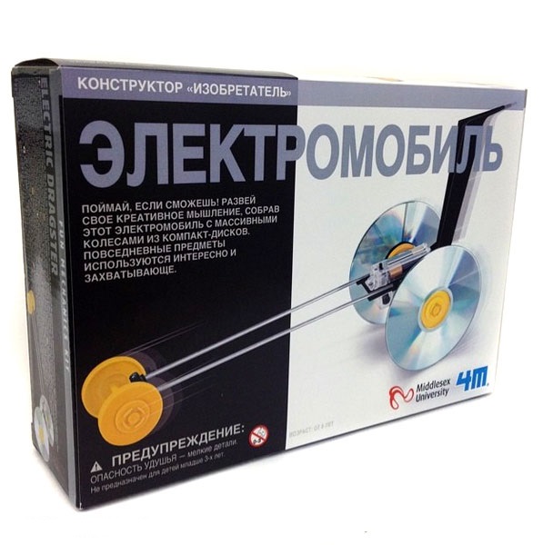 Собери настоящий электромобиль! Немного терпения - и неуловимая машина с колесами из старых компакт-дисков готова. Конструктор 4М Электромобиль - это не просто оригинальный конструктор, а скорее небольшой эксперимент для юного инженера. Ведь именно такую цель ставят перед собой инженеры из компании 4M Indastries: развитие творческих способностей, воображение и тяга к техническим экспериментам.