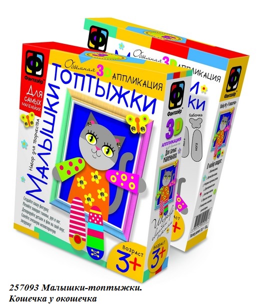 Объемная 3D аппликация для самых маленьких "Малышки-топтыжки" научит вашего малыша с удовольствием собирать картонные детальки в правильном порядке, чтобы получилась веселая фигурка. Для свободного творчества тоже найдется место - пайетки, цветные стикеры и помпоны можно клеить куда угодно! В набор входит: объемная рамка, цветной фон-основа, фигурные картонные детали, двухсторонний скотч, блестящие пайетки, пушистые помпоны, разноцветные наклейки разной формы. Несложный и занимательный творческий процесс принесет удовольствие ребенку, поможет развить творческие способности, фантазию и внимательность, а получившаяся яркая картина станет достойным украшением интерьера или подарком на любой праздник.