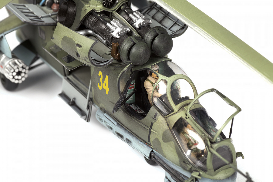 Ми-24 - первый советский специализированный боевой вертолёт. Активно использовался в годы Афганской войны, в период боевых действий в Чечне, а также во многих региональных конфликтах. Модификация Ми-24П отличается от стандартной отсутствием пулемёта и установленной на правом борту авиационной пушкой ГШ-ЗОК, предназначенной для борьбы с бронетехникой противника.