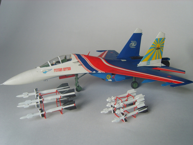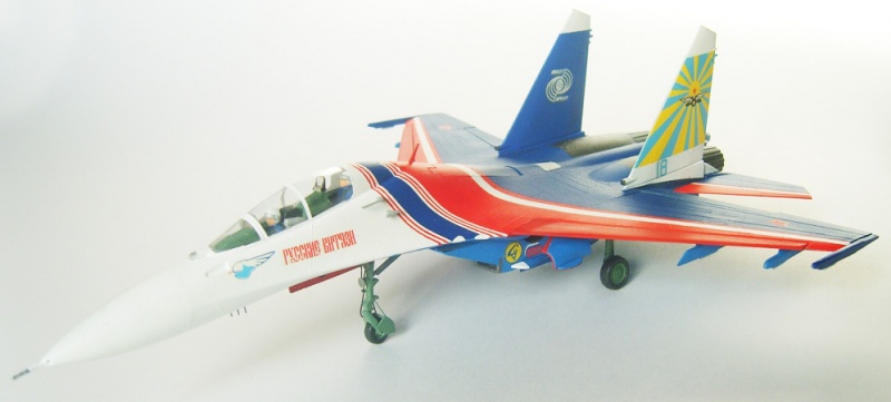 «Русские витязи» -одна из очень немногих в мире пилотажных групп на боевых, а не легких учебных машинах. При этом сочетании высоких летных данных Су-27 и мастерства летчиков-асов неизменно вызывает аплодисменты зрителей на всех публичных показах и авиасалонах.
