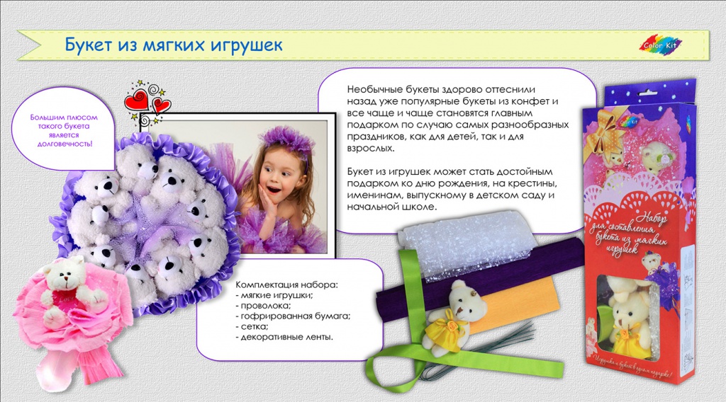 Создание букетов по праву считается самым настоящим искусством, вот только теперь им может овладеть каждый ребенок, так как у нас в каталоге продаются наборы для творчества для создания букета из мягких игрушек!