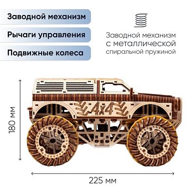 Сборная модель из дерева представляет собой вездеходных джип с большой детализацией и амортизирующей подвеской.