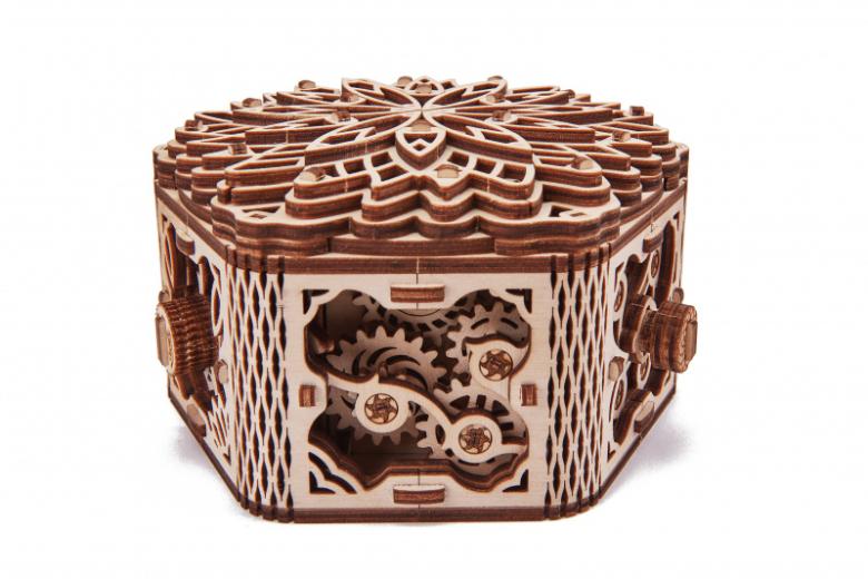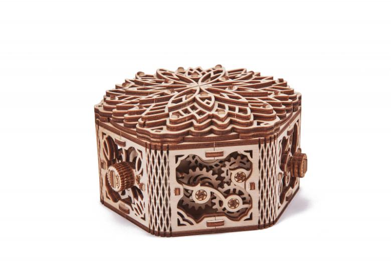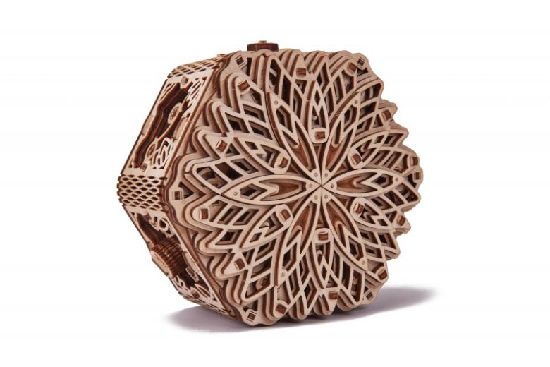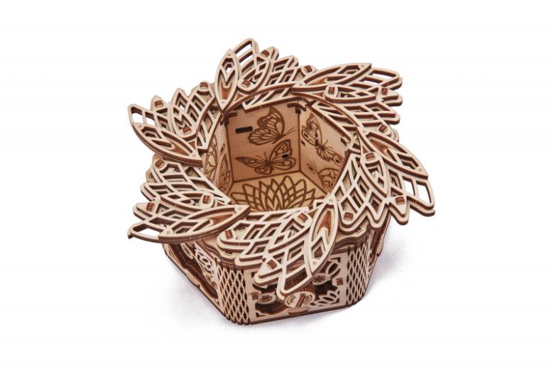 Особенностью этой шкатулки в восточном стиле с элементами механики является не только привлекательный внешний вид, но и система ее открытия. Она оснащена тремя секретами, и только активируя их все, получится открыть этот таинственный цветок. Открывается она через диафрагму. Не менее увлекательным становится и процесс ее сборки.
