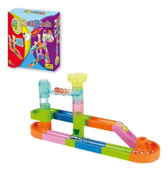- 16 цветных и полупрозрачных деталей для сборки горок-лабиринтов,