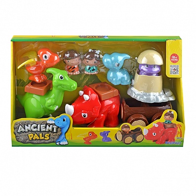 В комплекте: 4 фигурки динозавров, 1 яйцо с детенышем, 2 фигурки пещерных людей, 1 машинка.