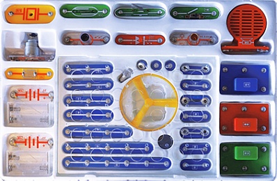 Вместе с конструктором поставляется книга, содержащая 180 электрических и электронных схем, которые можно собрать из этих элементов.