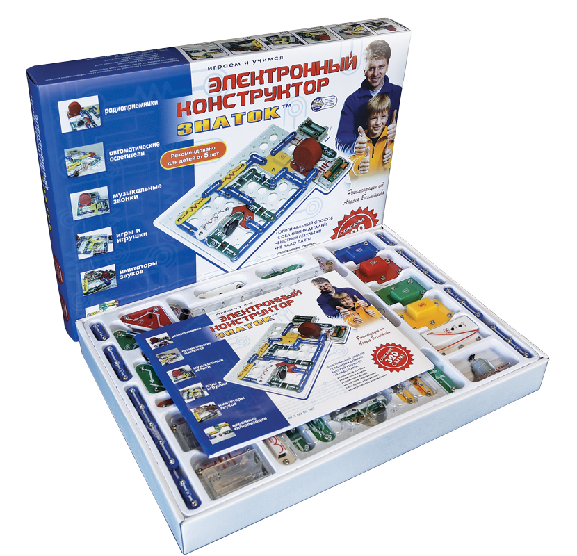 Электронный конструктор "Знаток-320" включает десятки элементов, из которых даже ребенок сможет составить 320 электрических схем. Соединяя по схеме выключатели, лампочки, светодиоды, электромотор, транзисторы, конденсаторы и другие элементы электроники, Вы и Ваш ребенок без труда сможете собрать логические элементы, охранную сигнализацию, автоматические осветители, музыкальные звонки, приборы, передающие звуки природы, электронные игры и игрушки и т. д.