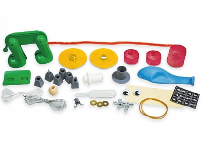 устройство для ходьбы, держатель для банки, одна пара зрачков, соединитель для крышек, 2 бутылочные крышки, мундштук, соединитель для компакт дисков, воздушный шар, 2 наконечника для трубки, 2 резинки, крючок, пипетка, 3 медные шайбы, 6 пластиковых грузов, бирки с номерами, эластичная серебристая струна, гайки, деревянная бусина, ершик для чистки труб, шнурок, двусторонняя клейкая лента, инструкция на русском языке