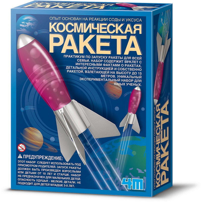 Набор Космическая Ракета, 4М предназначен для юных исследователей, которые смогут сделать своими руками ракету, рассчитанную на вертикальный полет до 15 м. В качестве ракетного топлива Вы должны использовать уксус и пищевую соль. Когда элементы смешаются в корпусе ракеты, образуется газ диоксид углерода. В результате химических реакций объем газа увеличивается и выходит через дно ракеты наружу, тем самым создавая тягу и устремляя ракету ввысь. Этот набор послужит не только отличным практикумом по запуску ракеты для ребят, но и подстегнет их интерес к физике и химии.