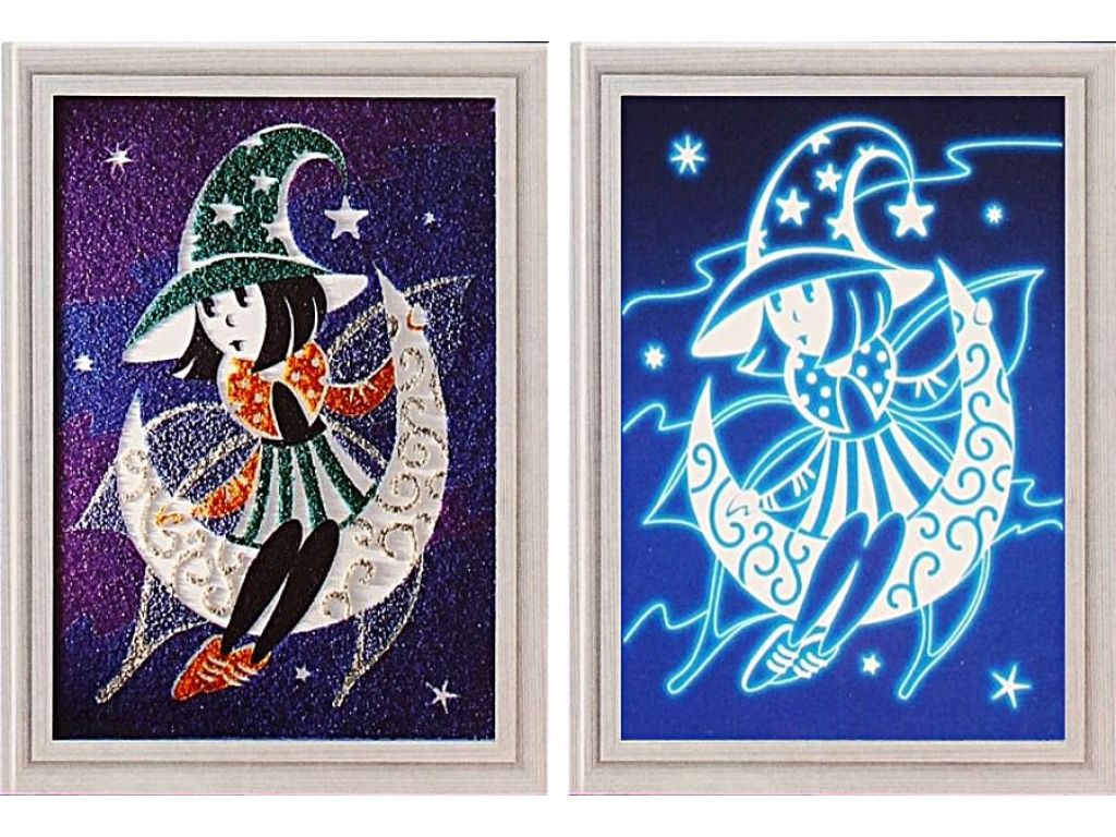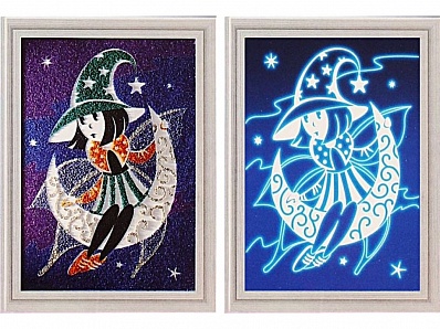 "Волшебная фреска" получила еще одно чудесное качество - теперь она светится в темноте! Светящаяся картина, которую можно сделать своими руками, обязательно понравится вашему малышу! Простая техника изготовления, интересный сюжет и необычные материалы сделают творческий процесс веселым и увлекательным. Малыш будет усердно трудиться над своим первым шедевром, попутно овладевая полезными навыками. А ночью с его картиной начнут происходить необыкновенные вещи! Небо из дневного станет ночным, окошки в домах зажгутся, месяц будет освещать не только картину, но и комнату волшебным синим светом.