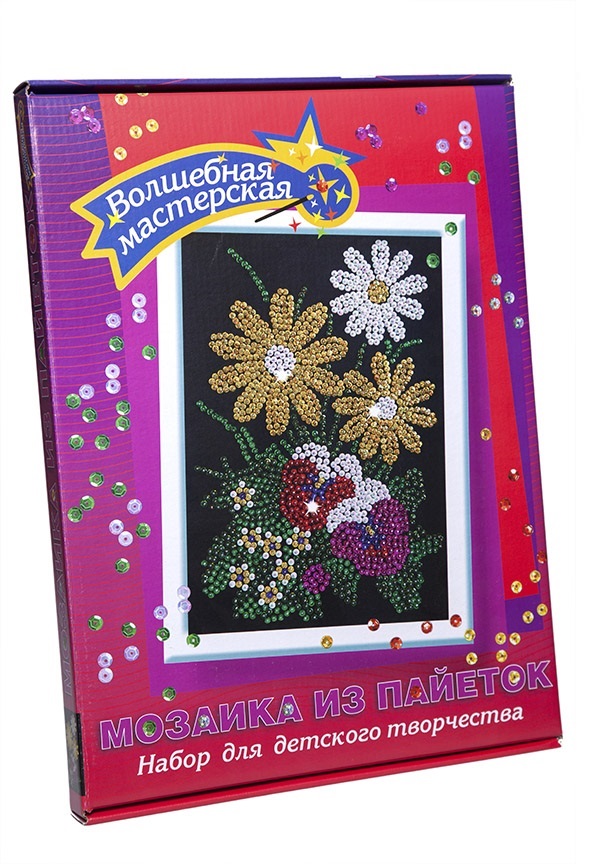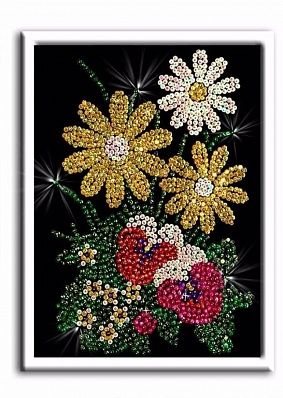 С помощью набора Картина из пайеток Букет можно создать замечательную картину с изображением разноцветных цветов. Картина выглядит эффектно и празднично потому, что она выполнена из маленьких блесток- разноцветных пайеток.