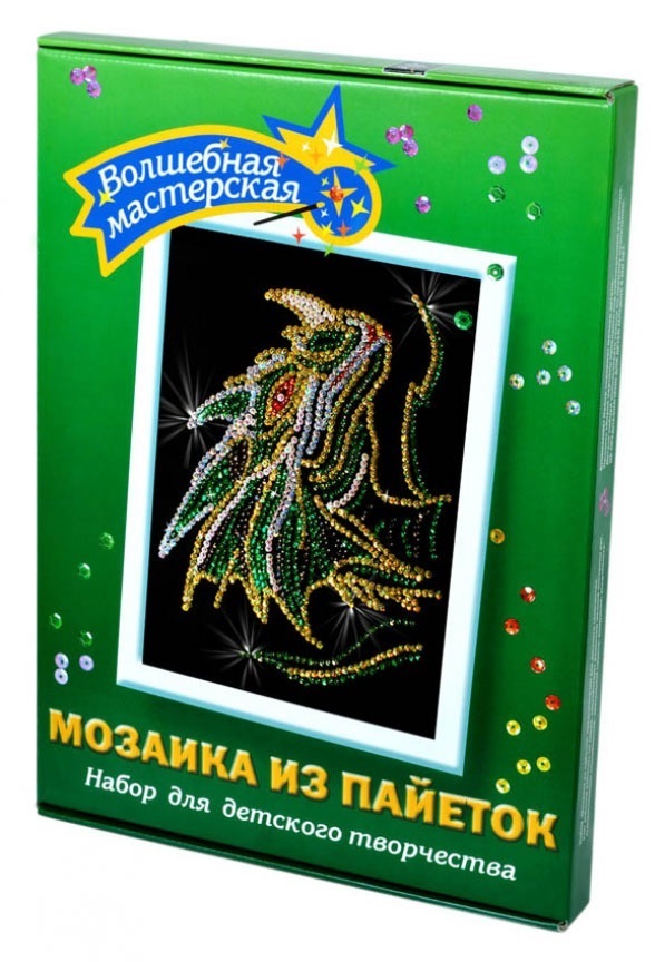 С помощью набора Картина из пайеток Дракон можно создать эффектную картину с грозным чудищем. Она выглядит празднично потому, что выполнена из маленьких блесток- разноцветных пайеток.