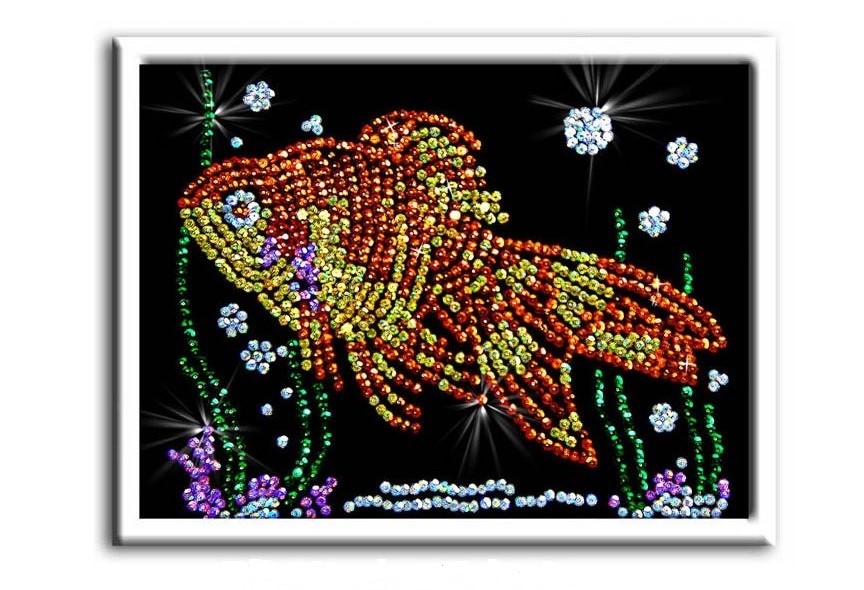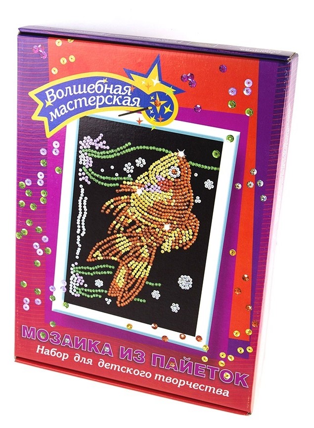 С помощью набора Картина из пайеток Золотая Рыбка можно создать шикарную картину изображением чудесных рыбок. Картина выглядит эффектно и празднично потому, что выполнена из маленьких ярких блесток- разноцветных пайеток.