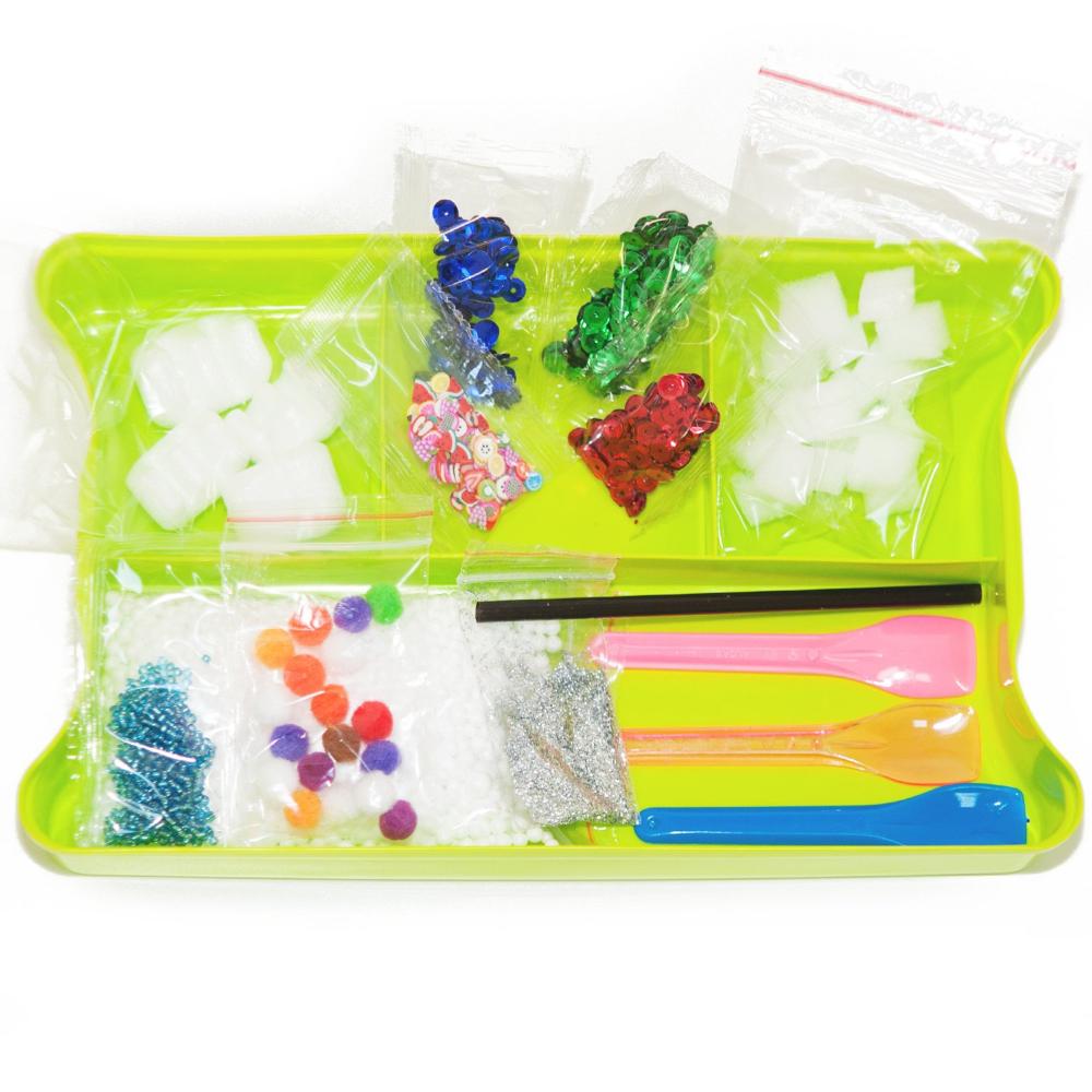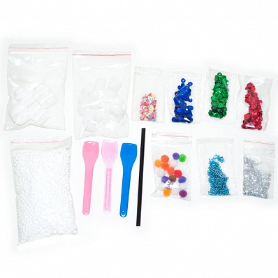 Для перемешивания в набор входят ложечки. В получившийся слайм можно добавить пенопластовые шарики, поролоновые кубики, пайетки, блёстки, помпоны, цветные фруктики, бусины и даже поп-корн!
