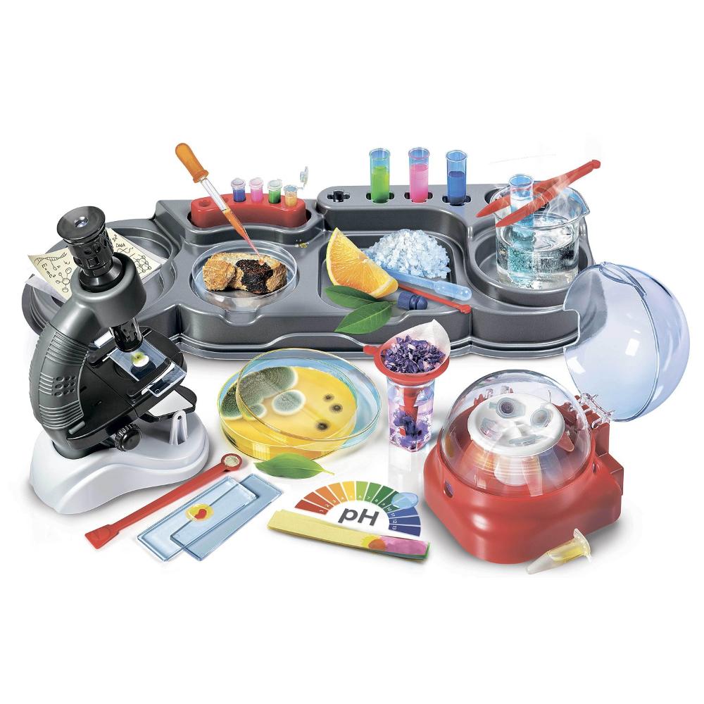 - Комплект содержит настоящие лабораторные инструменты, включая микроскоп, центрифугу и много других материалов.