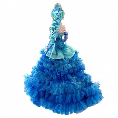 - Наряд сделан из разно-фактурных тканей, украшен бусинами и ленточками. Густые и пышные волосы уложены с сложную прическу, которую венчает корона.