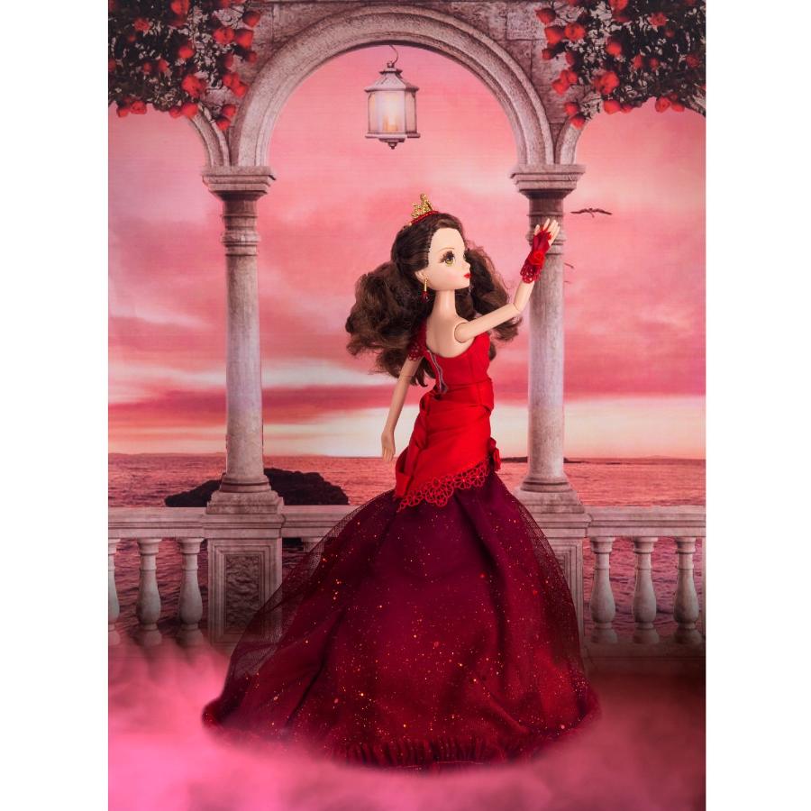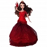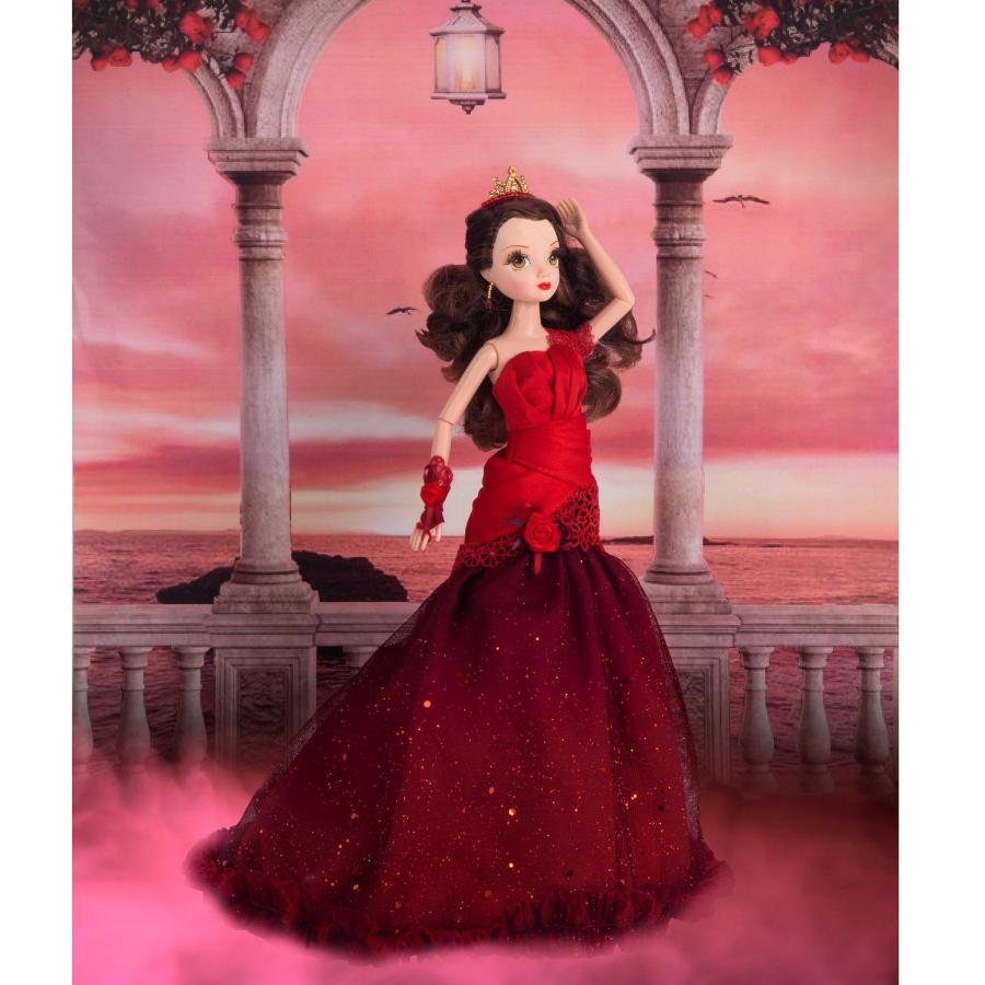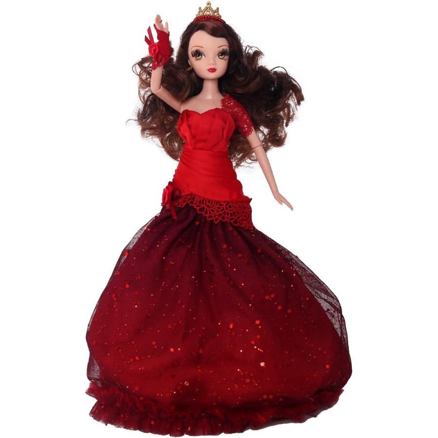 Её роскошное платье — настоящий шедевр. Его верх выполнен из красной ткани с декором, который красиво дополняет темно-красная роза. Пышный подол украшен блестками. На правой руке куклы перчатка-митенка, декорированная розой. Кукла имеет длинные шикарные волосы с вьющимися локонами, а её голову украшает корона.