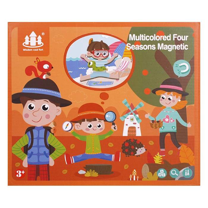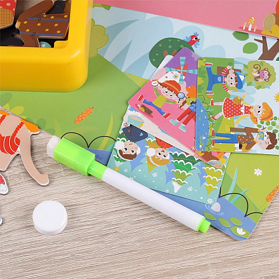 В набор входит двусторонняя магнитная доска (одна сторона цветная - для игры, другая сторона белая - для письма специальным маркером), части персонажей, карточки с подсказками, маркер, магнит.