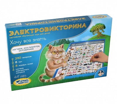 Электровикторина «Хочу все знать» расширяет кругозор, увеличивает словарный запас, развивает память, произвольное внимание и логическое мышление.Состав игры: