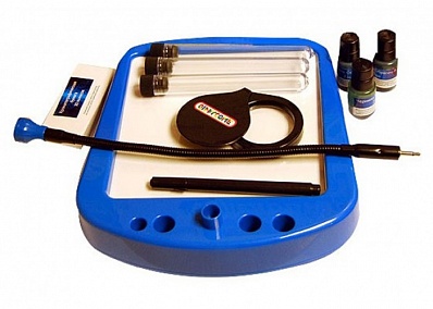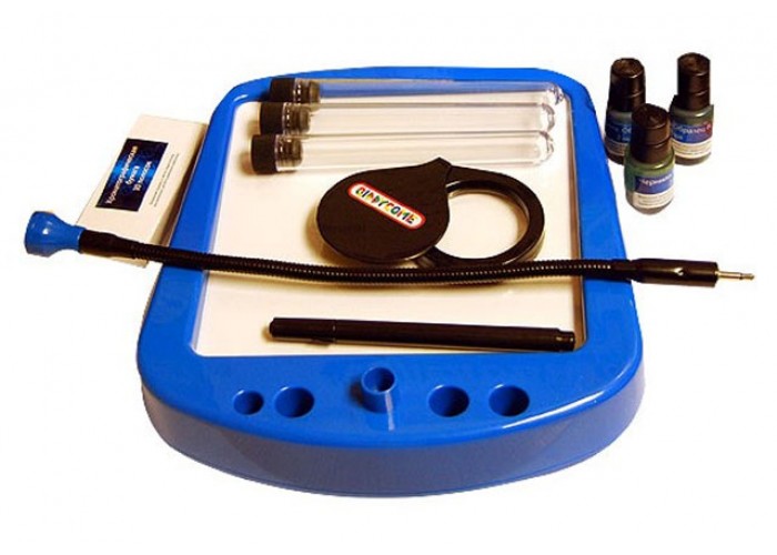Набор включает планшет с подсветкой, бесцветный фломастер, лупу, пробирки, хроматографическую бумагу, карточку для определения наклона букв, графологический справочник, альбом для хранения записей, три бутылочки с чернилами, секретную папку, в которой хранятся карточки, образцы почерка, банковские чеки и прочие предметы, которые помогут раскрыть загадочные преступления. Также в набор входит красочно иллюстрированная инструкция на русском языке, содержащая научно-популярную статью.