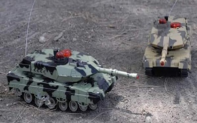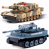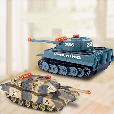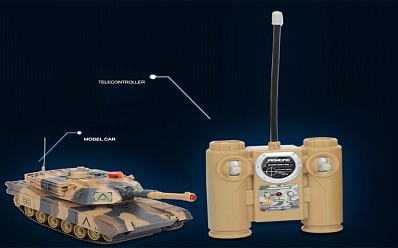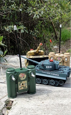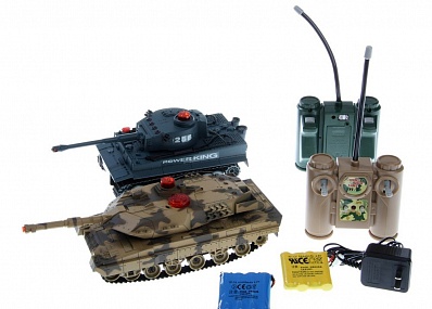 Набор из двух танков на радиоуправлении - управляются по двум каналам - 27 мГц (модель1), 40 мГц (модель2). Пульты управления рычажкового типа позволяют управлять движением каждой гусеницы, повышая маневренность моделей. Башня танка вращается влево-вправо при помощи передних кнопок пульта.
