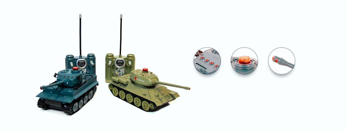 Простое управление при помощи пульта ДУ позволит и взрослому, и ребенку без труда воссоздать сражение знаменитых танков. Каждая модель оборудована системной инфракрасного наведения и ИК-пушкой: при попадании в соперника на его модели гаснет 1 из 4 лампочек-индикаторов, а также при разной степени повреждения танка у него начинают «отказывать» различные функции. Для еще большей реалистичности боевые действия сопровождаются световыми и звуковыми эффектами. Башня танков может поворачиваться на 300°, пушка – двигать вниз и вверх.