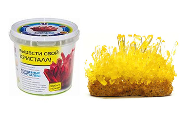 Большой кристалл желтый. Он прекрасно подойдет для ребенка, который интересуется различными экспериментами уже давно, и хочет попробовать вырастить что-то невероятно!.