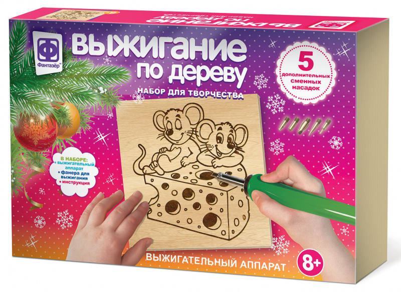 - Набор представлен компактным аппаратом со сменными насадками и фанерой для выжигания.