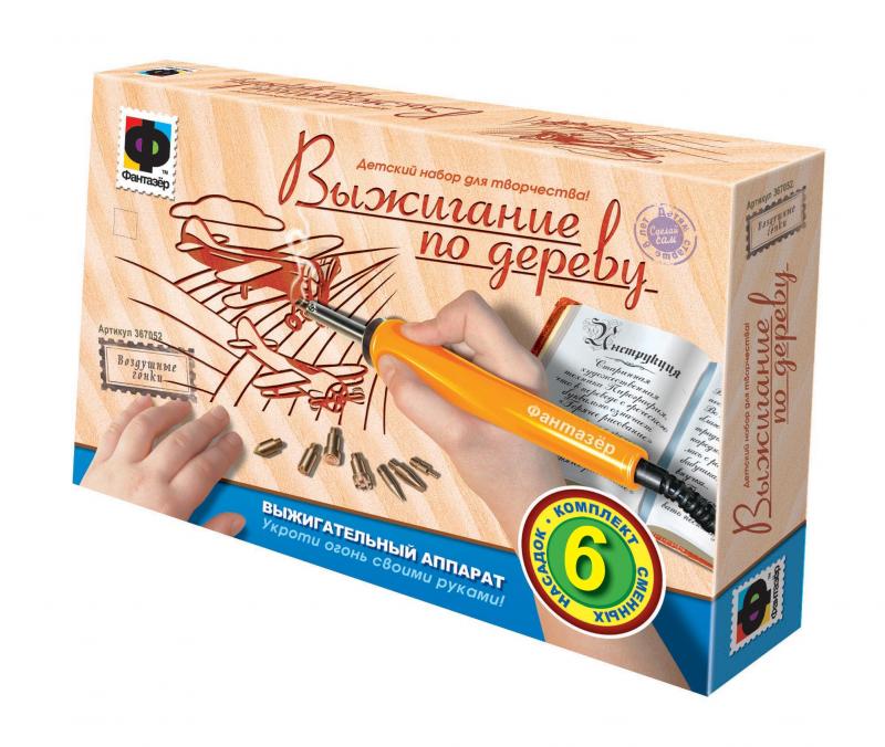 Прибор для выжигания Фантазер — отличный подарок для детей от 7 лет. Этот набор поможет выработать усидчивость, развить фантазию и получить навыки работы по дереву, которые обязательно пригодятся в будущем. К прибору прилагается 6 различных насадок, инструкция, а также две деревянные дощечки. На одной нанесено готовое изображение, на второй ничего нет. Когда ребенок освоит мастерство выжигания, то сможет самостоятельно придумать сюжет картины и воплотить его на чистой дощечке. Желательно, чтобы дети начинали обучение под присмотром взрослых.